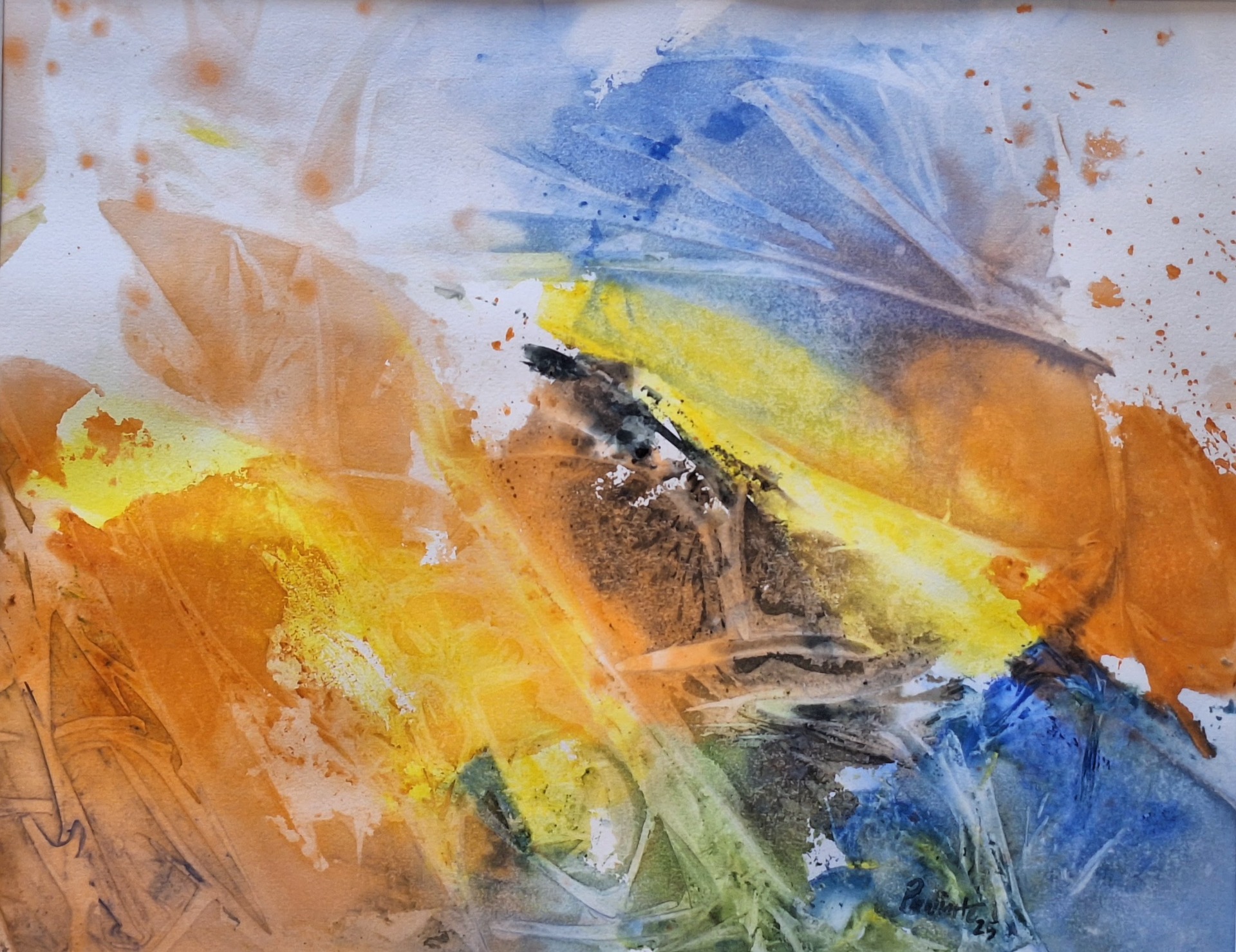 Warm, vibrant hues of yellow and orange merge with blue brushstrokes, creating a seemingly radiant interplay subtly charged with hidden tension.