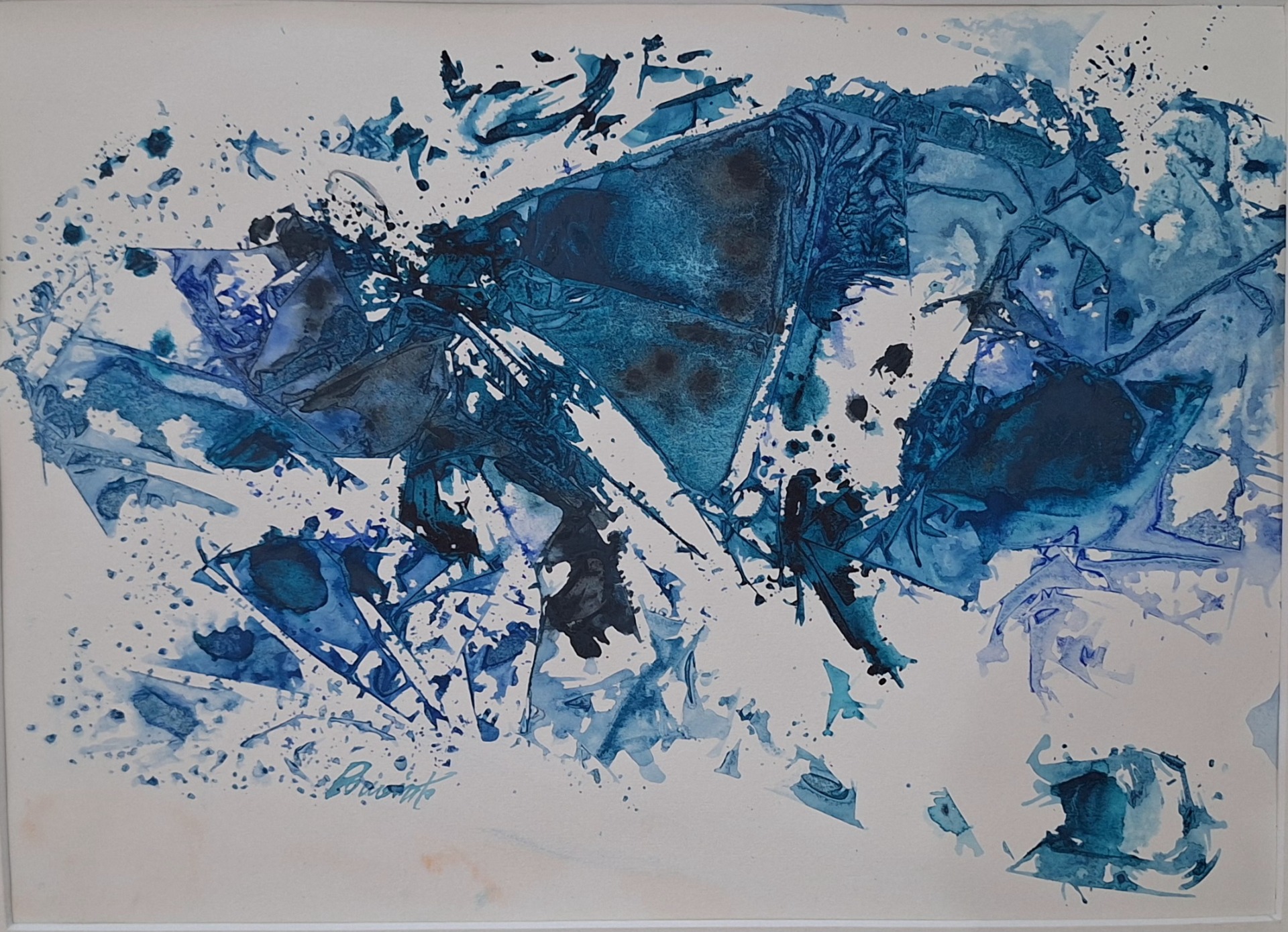 In Oceano Frammentato, il blu profondo si frantuma in una sinfonia di linee spezzate e schegge visive. Le tinte fredde si rincorrono come onde disorientate, riflettendo un mare che non è più intero, ma disperso, rotto, sofferente.