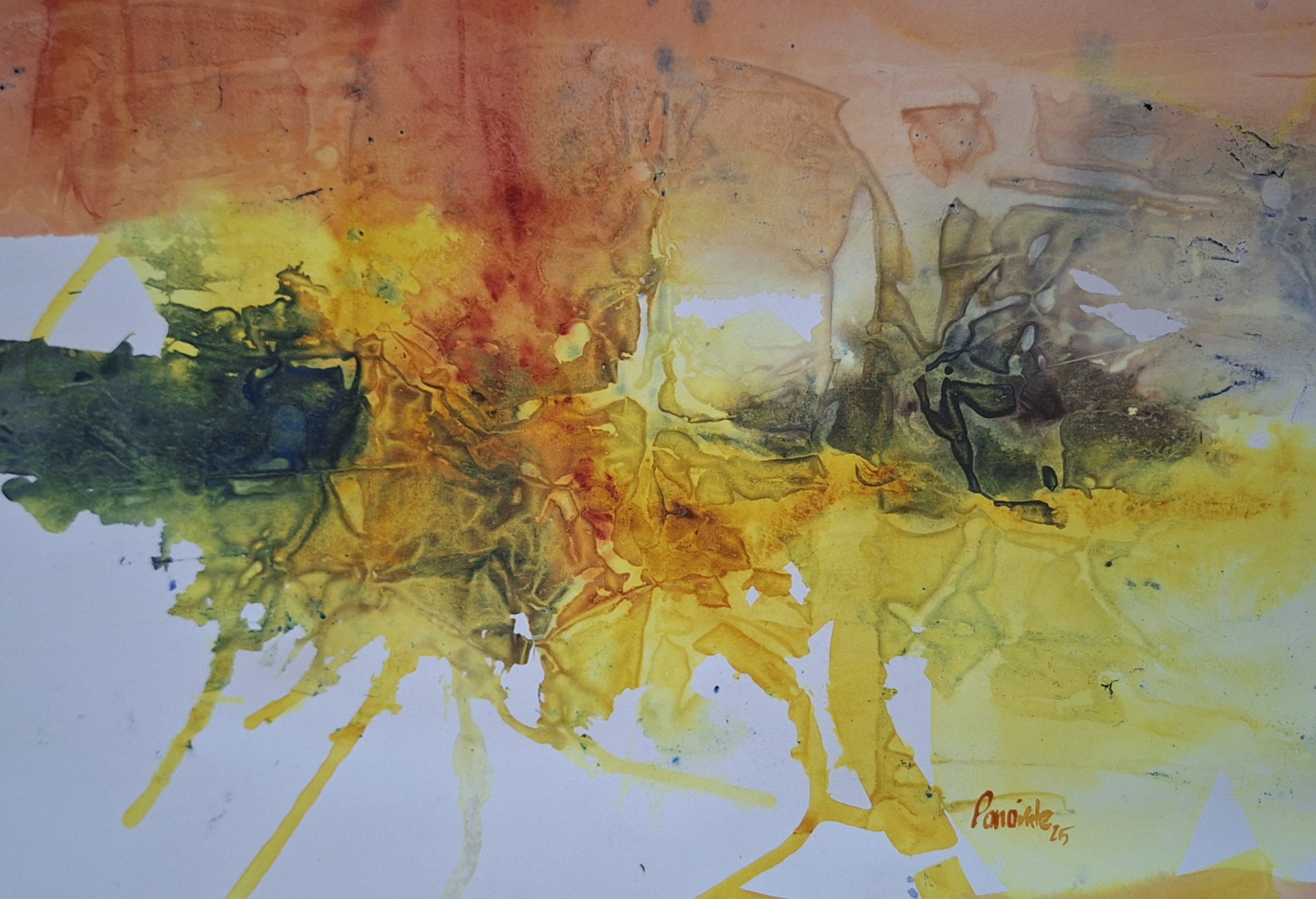 Toni caldi e vibranti di giallo e arancione si fondono con pennellate di blu, dando vita a un intreccio apparentemente luminoso, ma attraversato da una tensione nascosta.