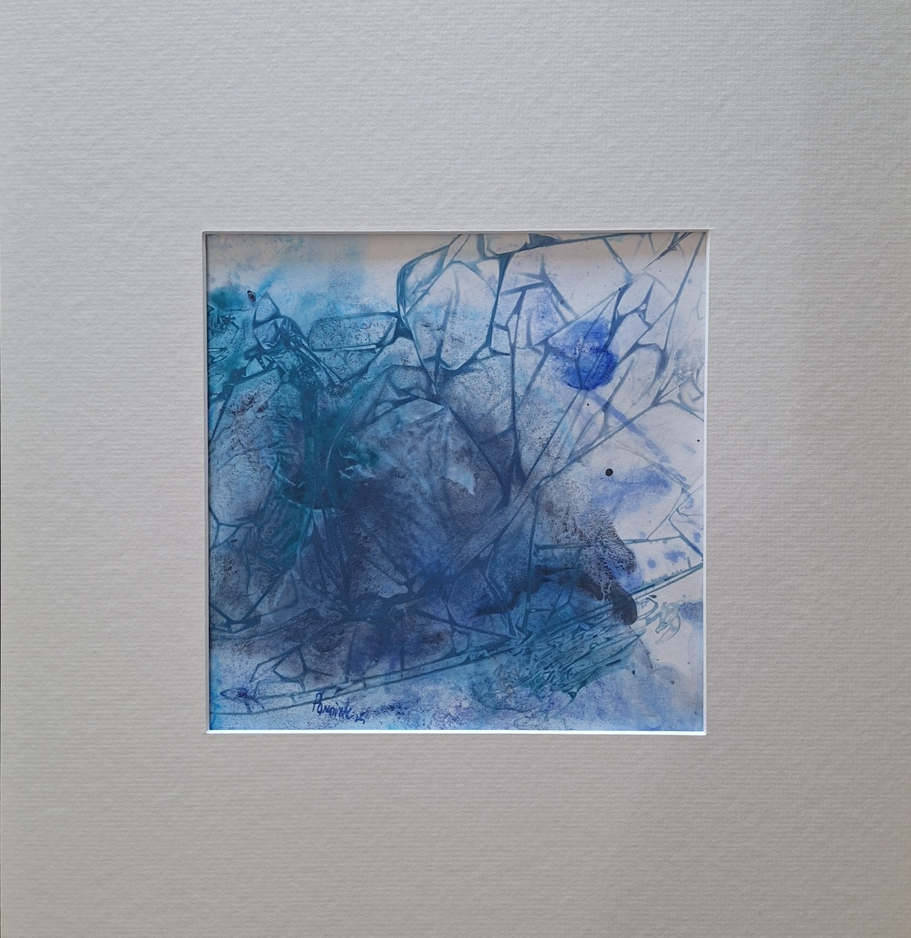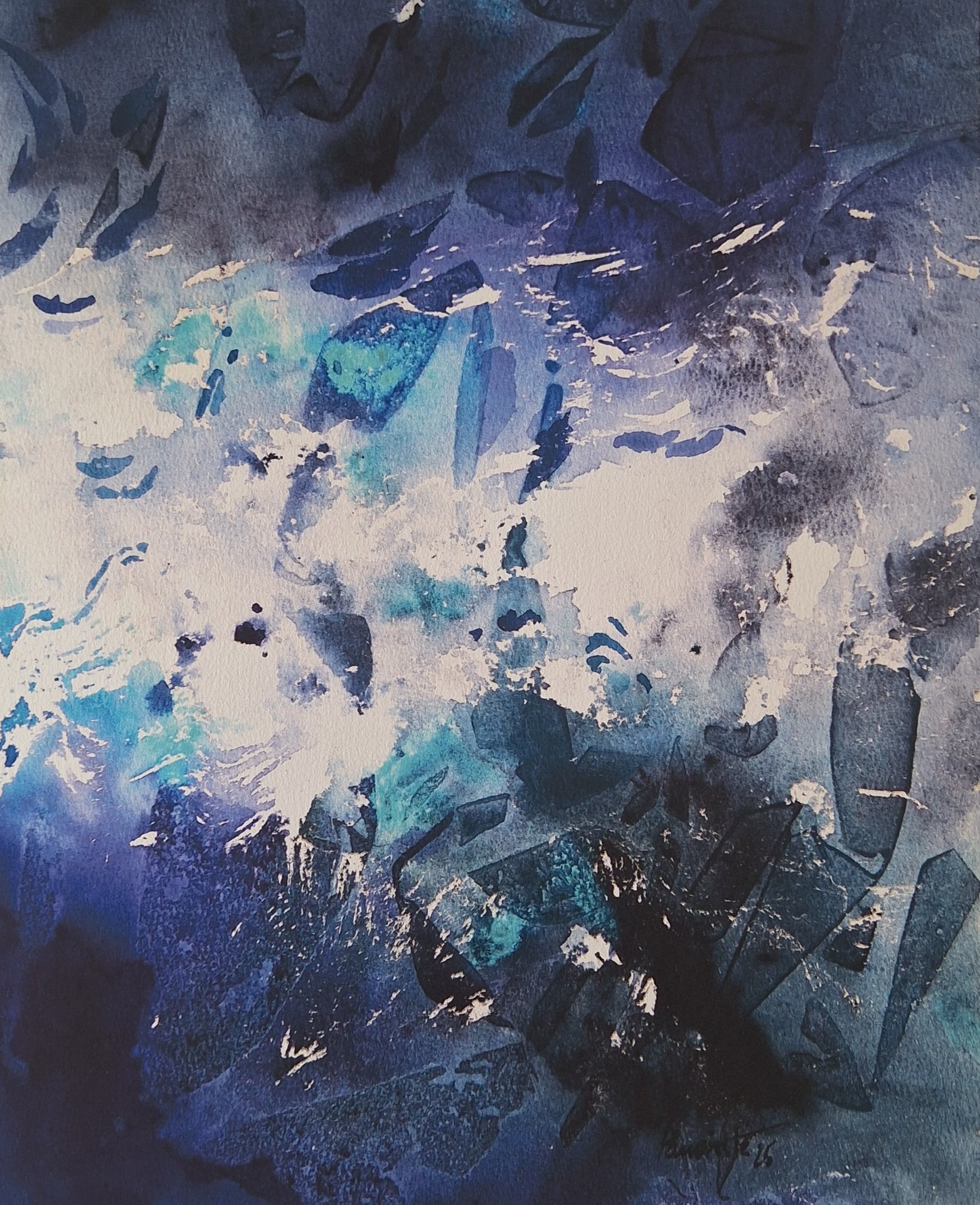 La composizione è dominata da tonalità fredde e trasparenti come blu, azzurro e turchese che evocano un fondale oceanico immerso in una quiete solo apparente. Le forme, lievi e frammentate, suggeriscono presenze sommerse: pesci, correnti, forse detriti.