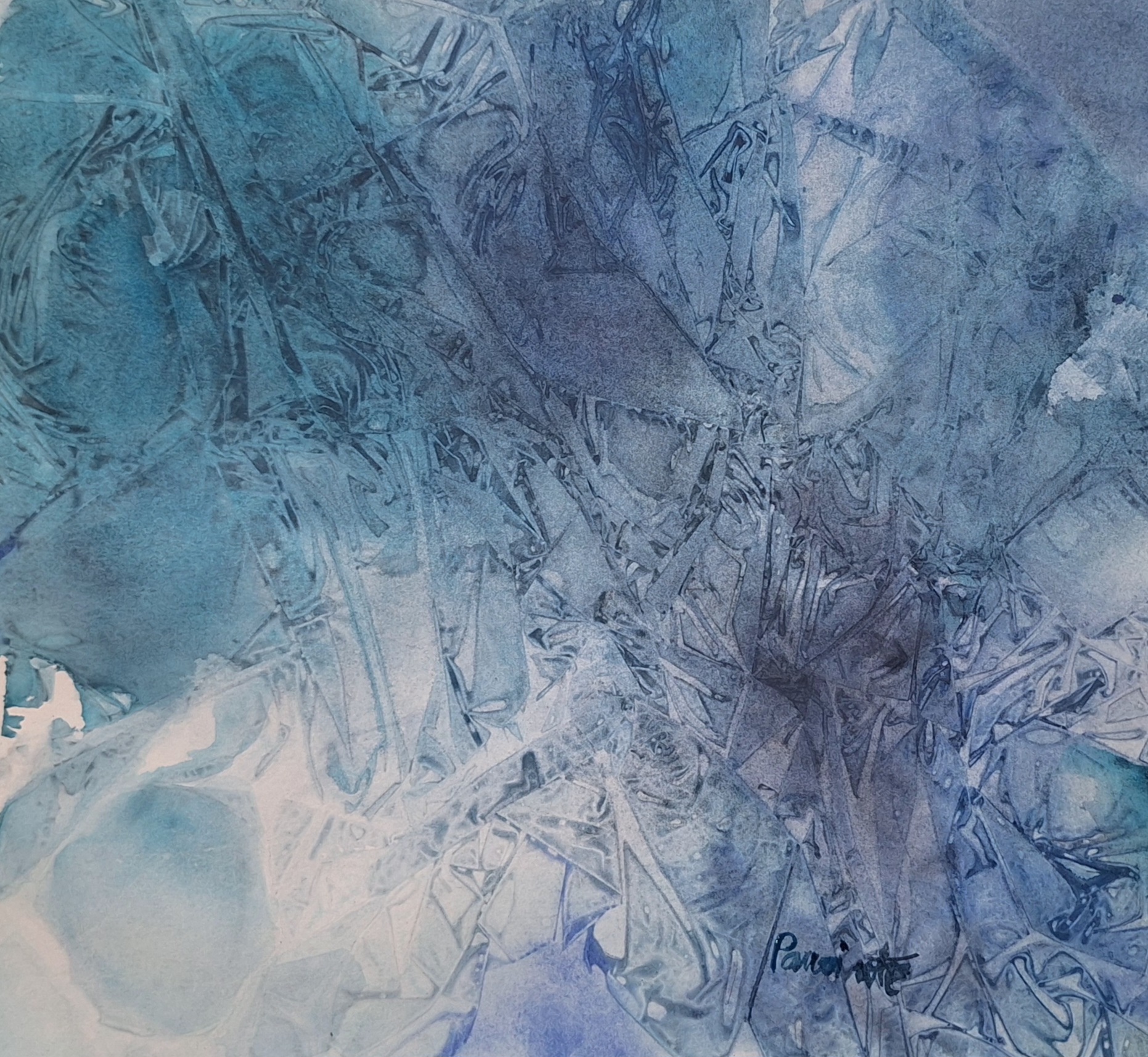 Opera astratta che richiama superfici naturali in trasformazione ghiaccio, acqua, sedimenti. Le texture stratificate ei toni freddi evocano un paesaggio fragile, sospeso tra materia e dissoluzione, come metafora di un equilibrio naturale da preservare, libero da interventi artificiali.